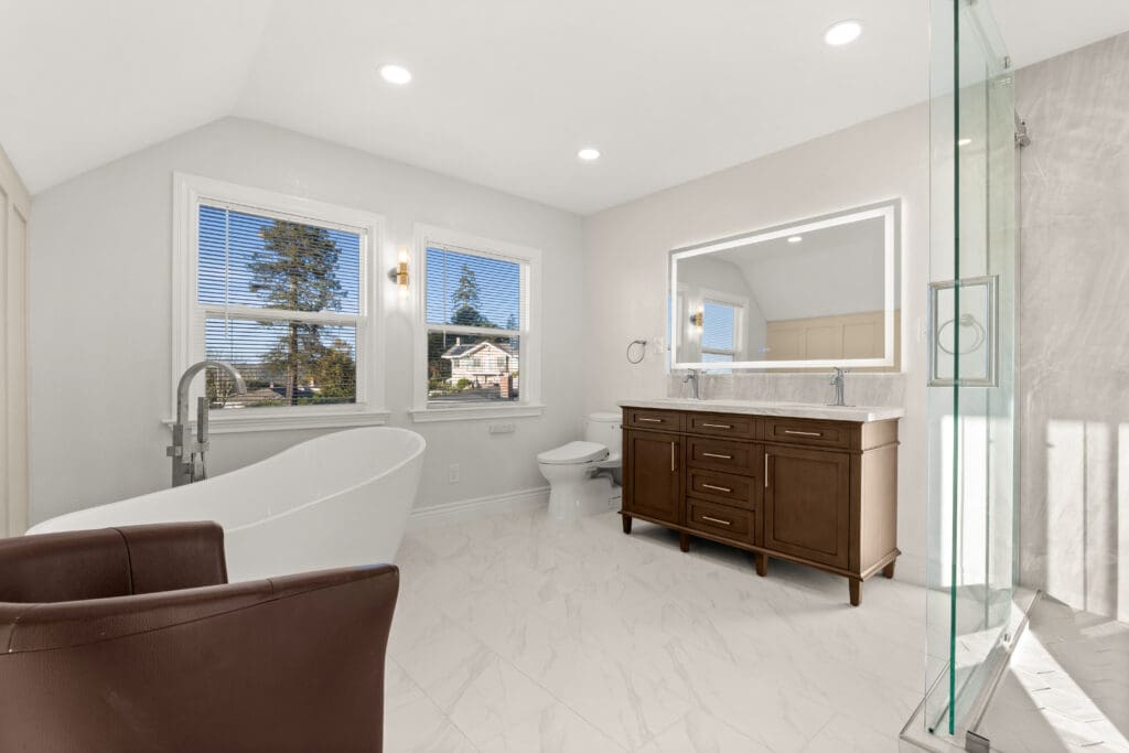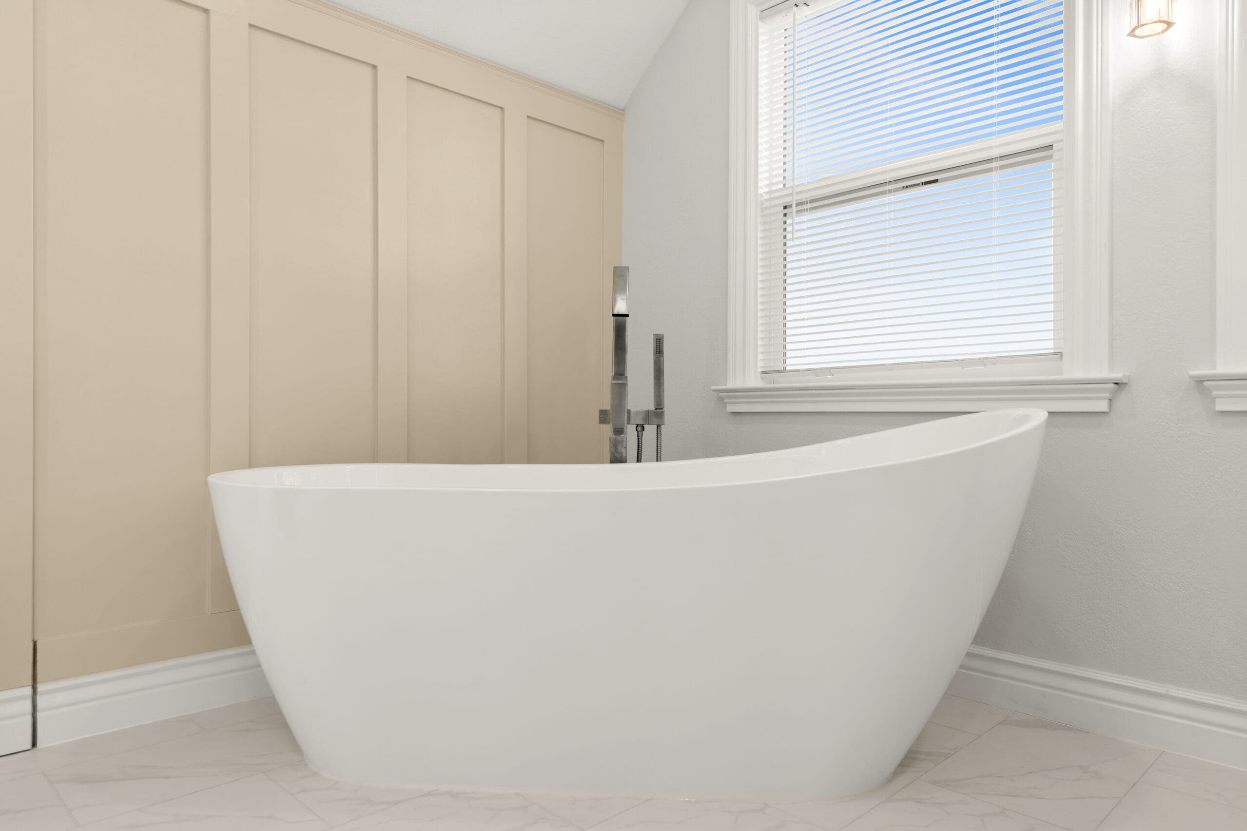 The bathroom features a freestanding soaking tub, positioned beneath large windows to maximize natural light. The tub is complemented by a floor-mounted tub filler, creating a true spa experience while keeping the layout open and uncluttered.