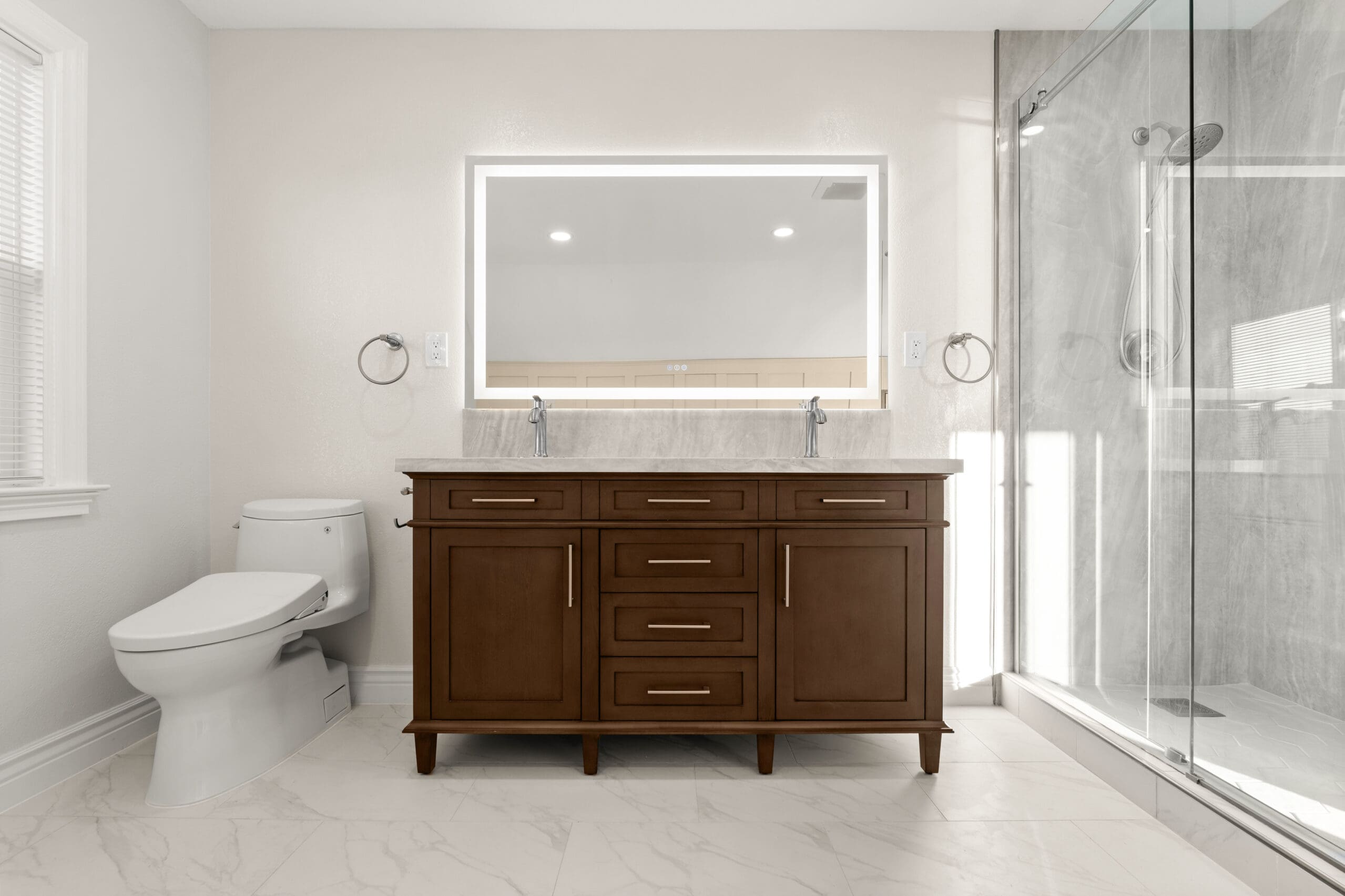 At the centre of the room is a custom double vanity featuring rich wood cabinetry, soft-close drawers, and modern brushed hardware. The vanity is topped with a stone countertop and paired with dual undermount sinks and sleek, contemporary faucets. A large backlit LED mirror provides even lighting and adds a refined, modern touch while improving daily usability.