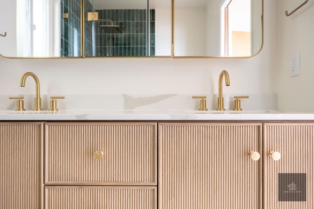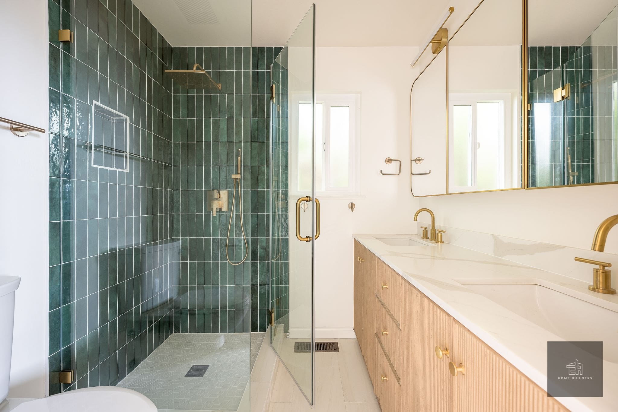 The shower box features vibrant green tiles that infuse the space with a refreshing pop of color, while the under-sink cabinet offers ample storage, keeping the area clutter-free. With an abundance of light and carefully chosen curves in mirrors and accessories, this master bathroom renovation exemplifies a harmonious blend of comfort and style, making it the perfect retreat for self-care.