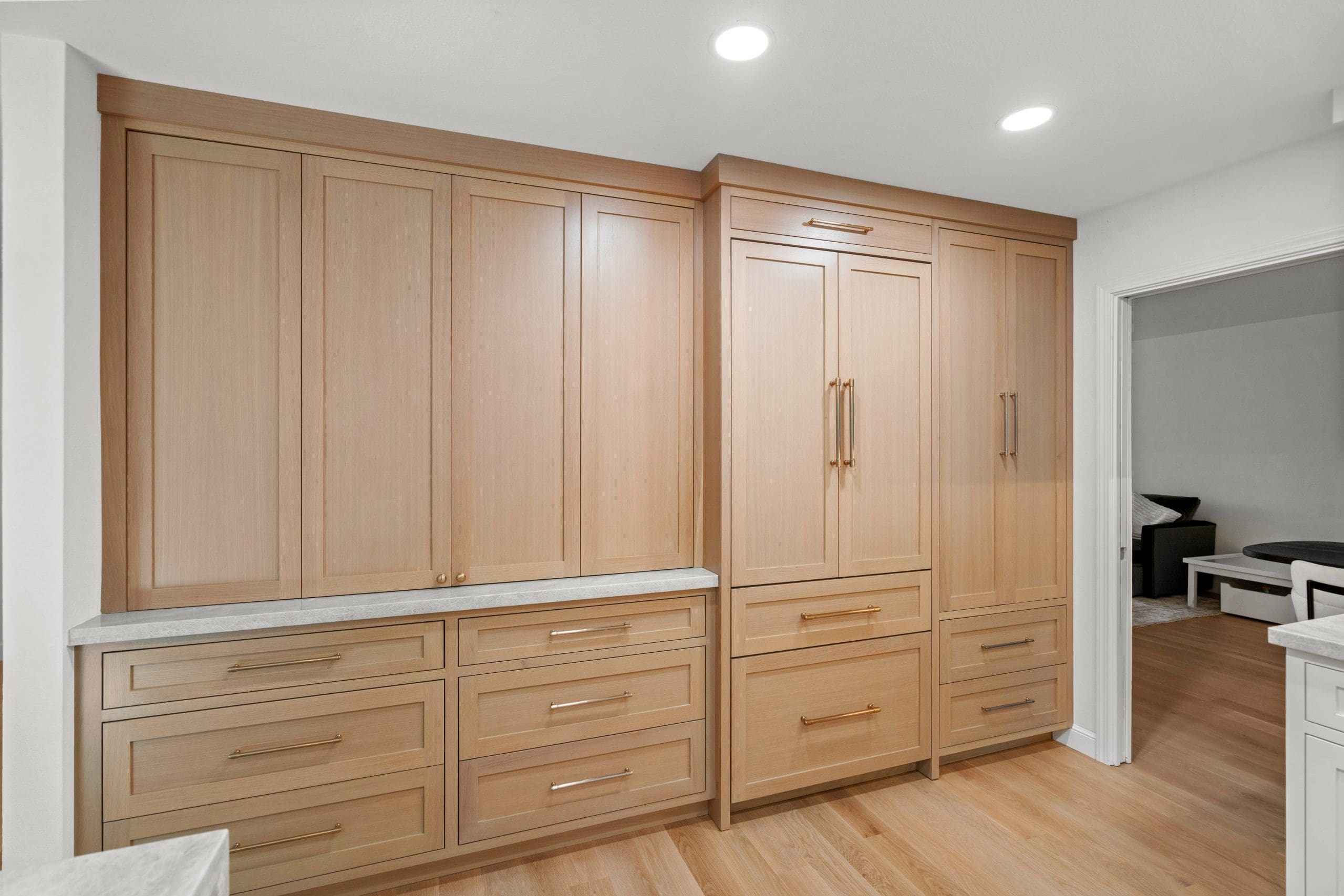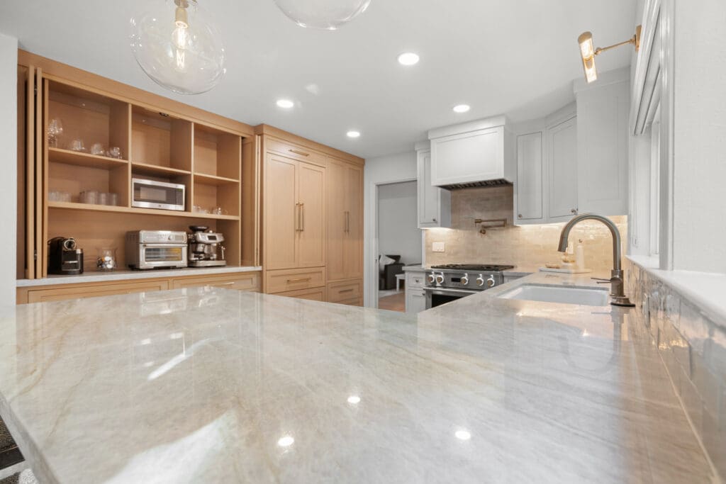 EA Home Builders executed a complete kitchen renovation and design that perfectly balances warmth and sophistication through expertly crafted custom cabinetry and thoughtful space planning. The project showcases a striking two-tone approach, featuring rich natural wood cabinetry with clean shaker-style doors and sleek brass hardware, beautifully complemented by crisp white perimeter cabinets that create visual contrast and brightness. The kitchen centers around luxurious quartz countertops with subtle veining that extends seamlessly across the expansive island and perimeter surfaces, providing both durability and elegance. A standout feature is the custom wood hutch area with open shelving and integrated appliance storage, creating a dedicated coffee and beverage station that combines functionality with architectural interest. The space is illuminated by stunning oversized glass globe pendant lights with brass accents that serve as both task and ambient lighting, while under-cabinet LED strips ensure optimal workspace illumination. The classic subway tile backsplash in neutral tones provides timeless appeal, and the warm hardwood flooring throughout creates continuity and adds natural texture. Large windows flood the space with natural light, while the open layout seamlessly connects to adjacent living areas, creating the perfect environment for both daily living and entertaining.